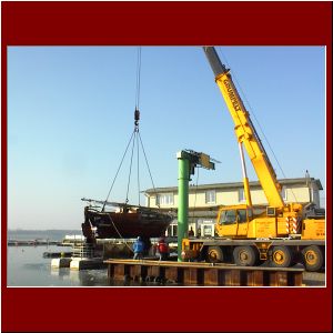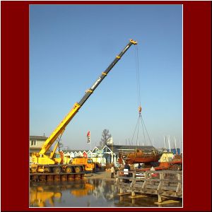 ![]() Der 60 Tonnen-Kran fährt in den Hafen ein |