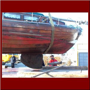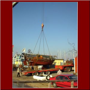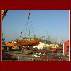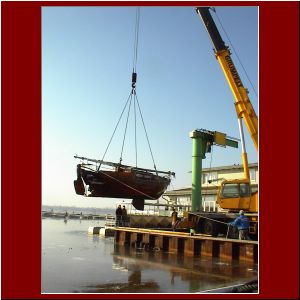 ![]() Der Kran hebt das Schiff aus dem erdrückenden Eis, aber so schnell lässt es nicht los, wie wir später noch erleben müssen. |