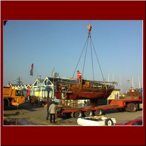 ![]() Mit dem Turmkran wird der Mast gelegt. |